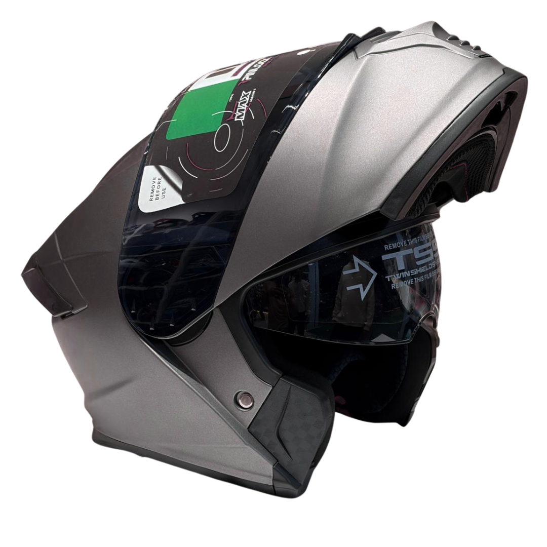 Convertible chin bar mechanism allows riders to switch between full-face protection and open-face convenience without removing the helmet.