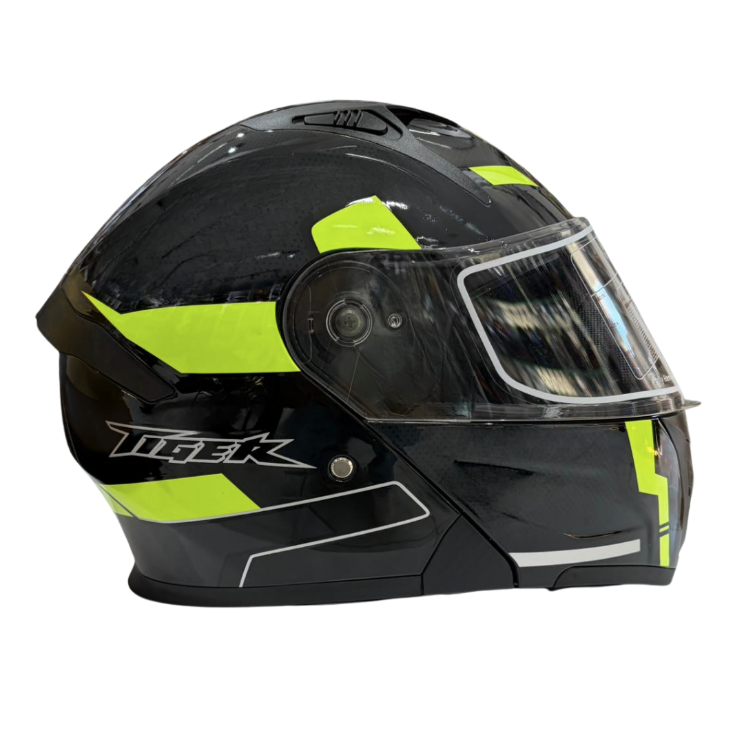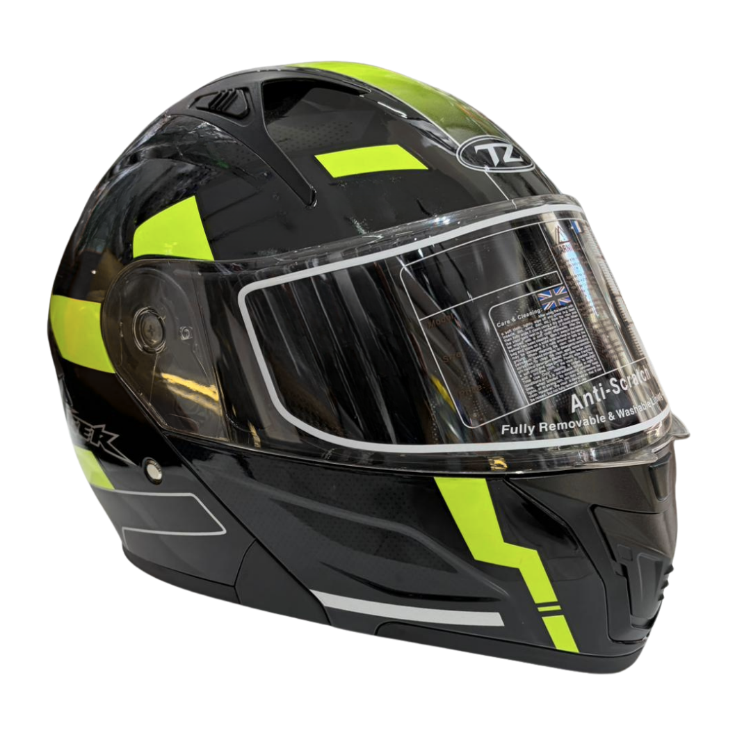Equipped with an external clear visor for full protection and an internal retractable sun visor to reduce glare during daytime riding.